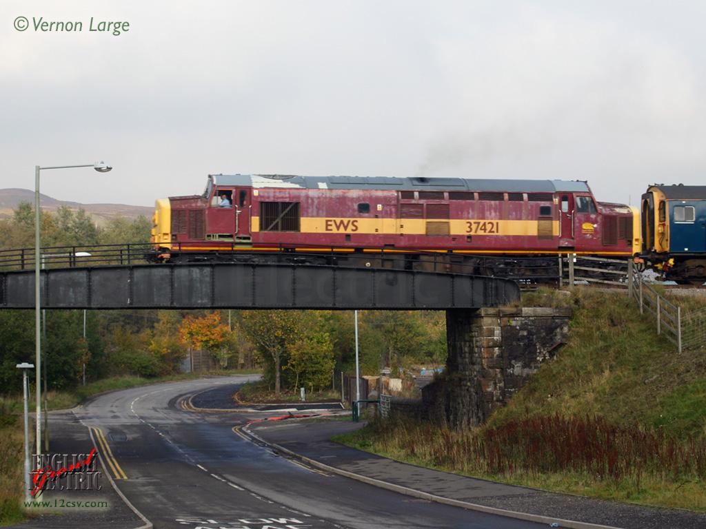 The Pontypool & Blaenavon Railway is partially located within a World Heritage Site and one of Wales' leading tourist attractions close by, the Big Pit Mining Museum. Class 37/4, no. 37421 is seen crossing the bridge just at the entrance to Big Pit with the 1515 Blaenavon HL to Whistle Inn train